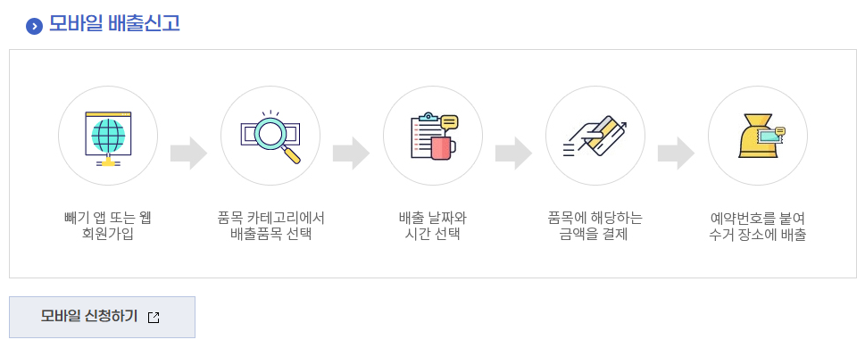 - 배출 신고: 온라인 신고 또는 각 권역별 수거업체로 연락(공동주택은 관리사무소에서 수거 연락)